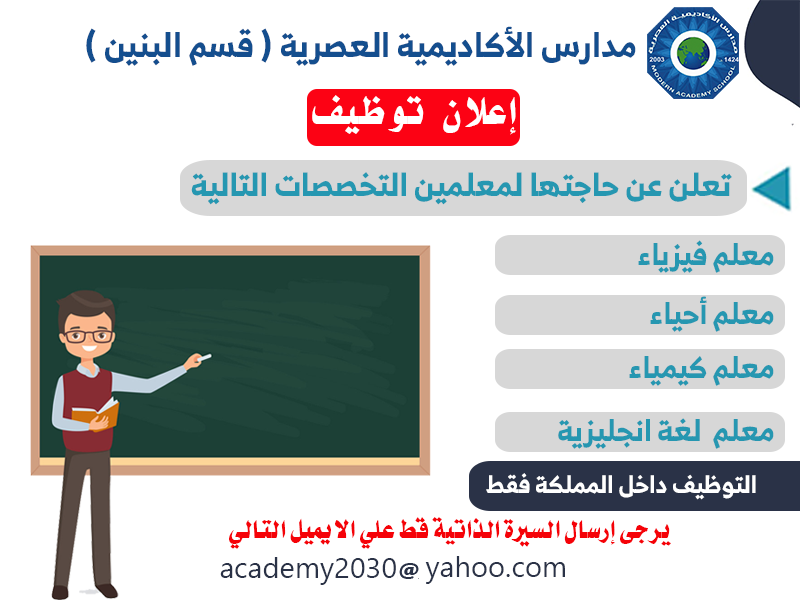 اعلنت مدارس الأكاديمية العصرية بحفر الباطن قسم البنين توفر وظائف تعليمية للرجال في التخصصات التالية فيزياء، أحياء، كيمياء، لغة انجليزية.