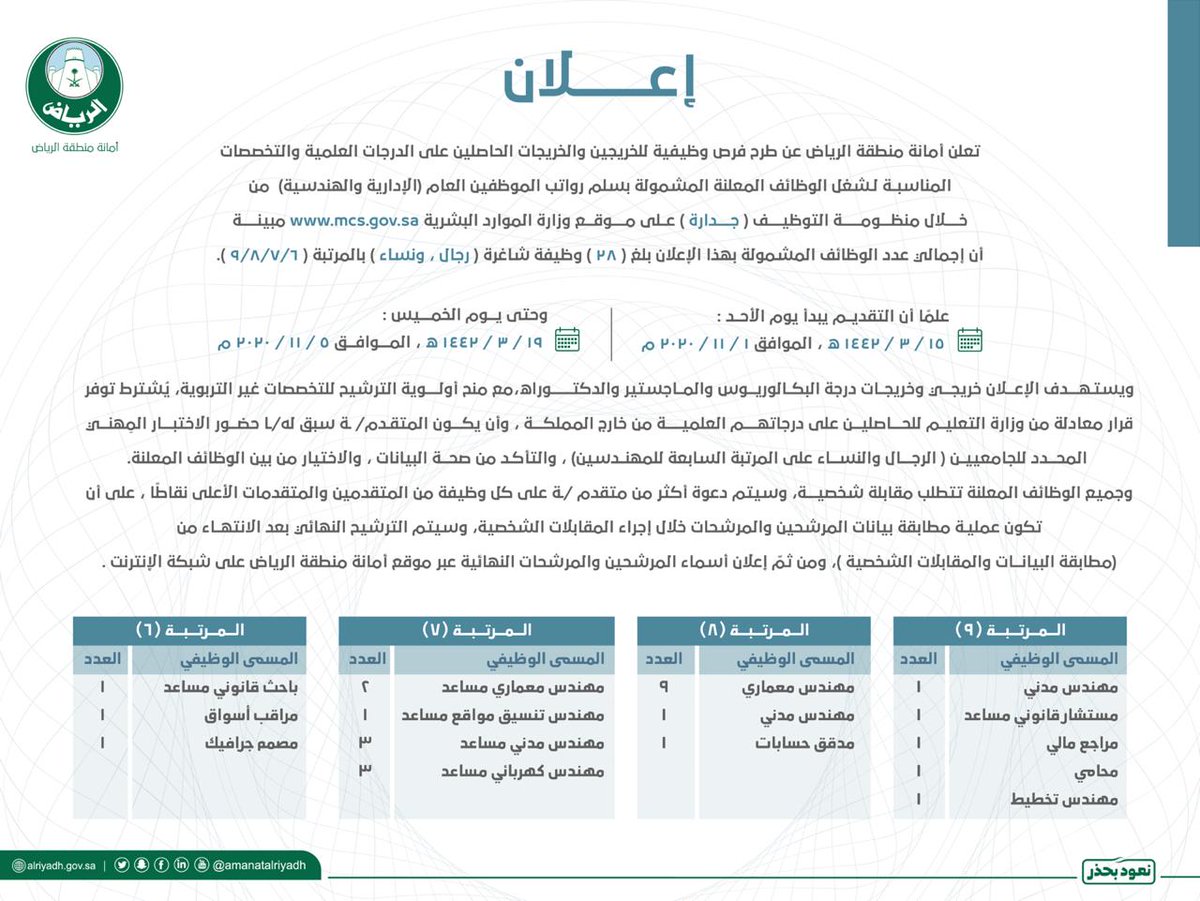 أمانة منطقة الرياض توفر 28 فرصة وظيفية للرجال والنساء في تخصصات هندسية وإدارية من خلال منظومة التوظيف جدارة.