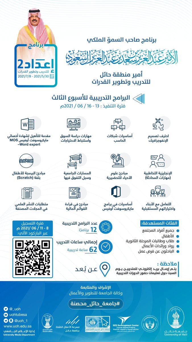 اعلنت جامعة حائل ممثلة عمادة خدمة المجتمع والتعليم المستمر عن إقامة 12 دورة تدريبية مجانية عن بعد في عدة مجالات من خلال برنامج صاحب السمو الملكي الأمير عبدالعزيز بن سعد إعداد 2.