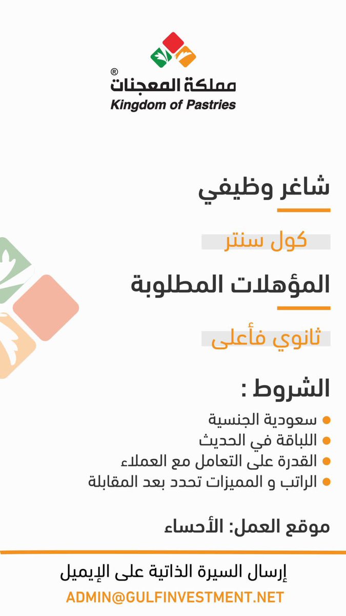 تعلن مملكة المعجنات عن وظيفة لحملة الثانوية العامة وما فوق