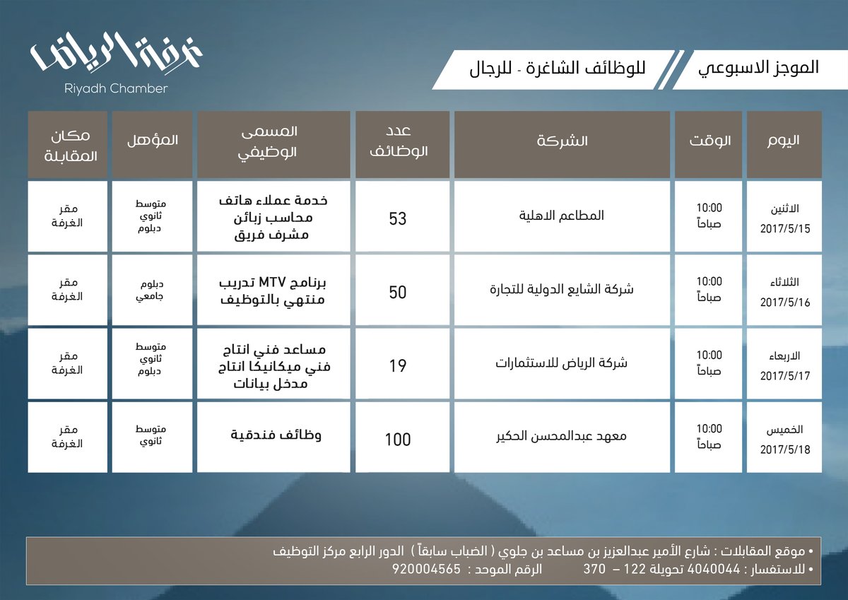 أعلنت الغرفة التجارية الصناعية بمدينة الرياض عن توفّر عدد (222) وظيفة شاغرة للشباب السعودي، لدى 4 شركات بالقطاع الخاص، هي: “المطاعم الأهلية- الشايع الدولية للتجارة- الرياض للاستثمارات- معهد عبدالمحسن الحكير”.