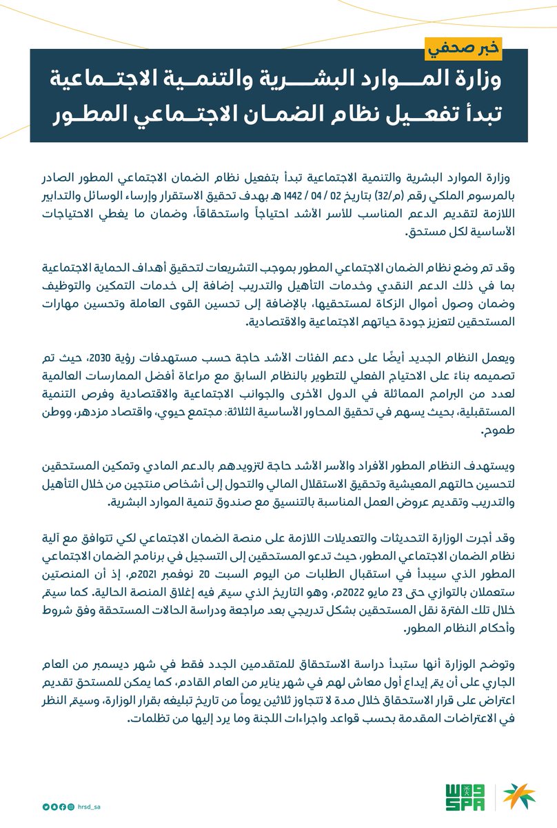 اعلنت وزارة الموارد البشرية والتنمية الاجتماعية تبدأ بتفعيل نظام الضمان الاجتماعي المطور الصادر بالمرسوم الملكي رقم (م/32) بتاريخ 1442/04/02هـ بهدف تحقيق الاستقرار وإرساء الوسائل والتدابير اللازمة لتقديم الدعم المناسب للأسر الأشد احتياجا واستحقاقا، وضمان ما يغطي الاحتياجات الأساسية لكل مستحق.