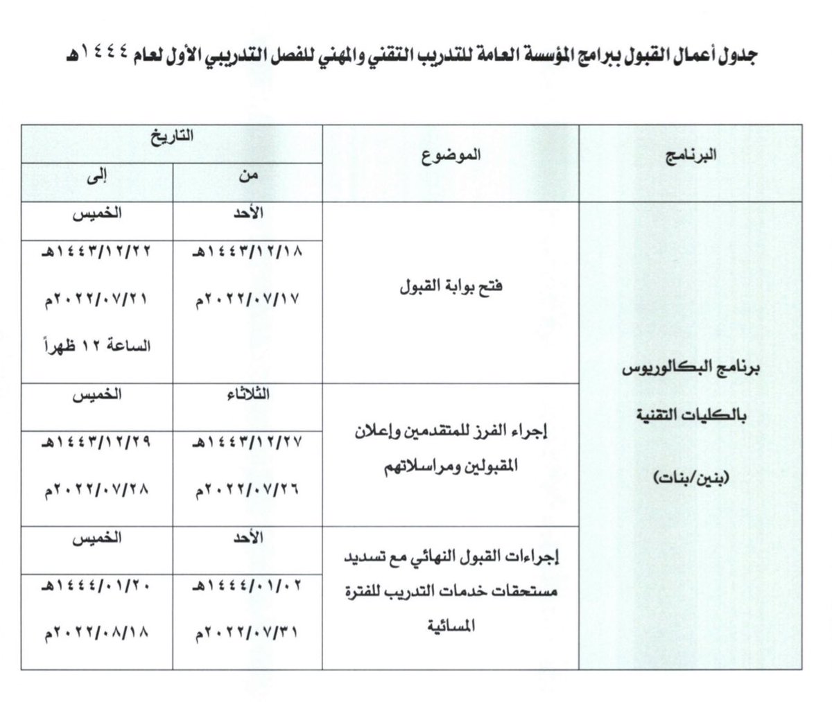 اعلنت المؤسسة العامة للتدريب التقني والمهني مواعيد القبول والتسجيل لبرامج البكالوريوس والدبلوم في الكليات التقنية وفروعها للبنين والبنات والمعاهد الصناعية والعمارة والتشييد الثانوية للفصل التدريبي الأول لعام 1444هـ.