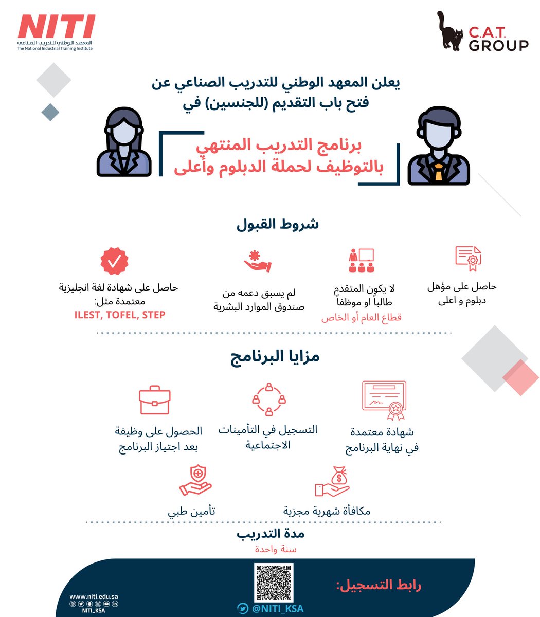 اعلن المعهد الوطني للتدريب الصناعي بالأحساء بدء التقديم (رجال / نساء) في برامج (تدريبية منتهية بالتوظيف)، واشترط المعهد أن يكون المتقدم سعودي الجنسية.