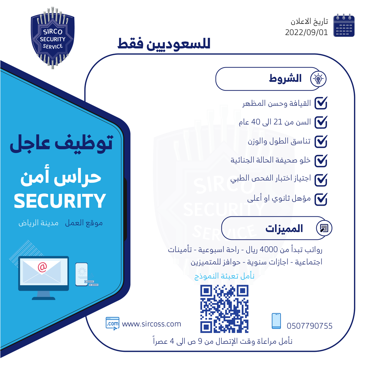 أعلنت الشركة السعودية العالمية للخدمات الأمنية (سيركو) فتح باب التوظيف للوظائف الأمنية بالرياض.