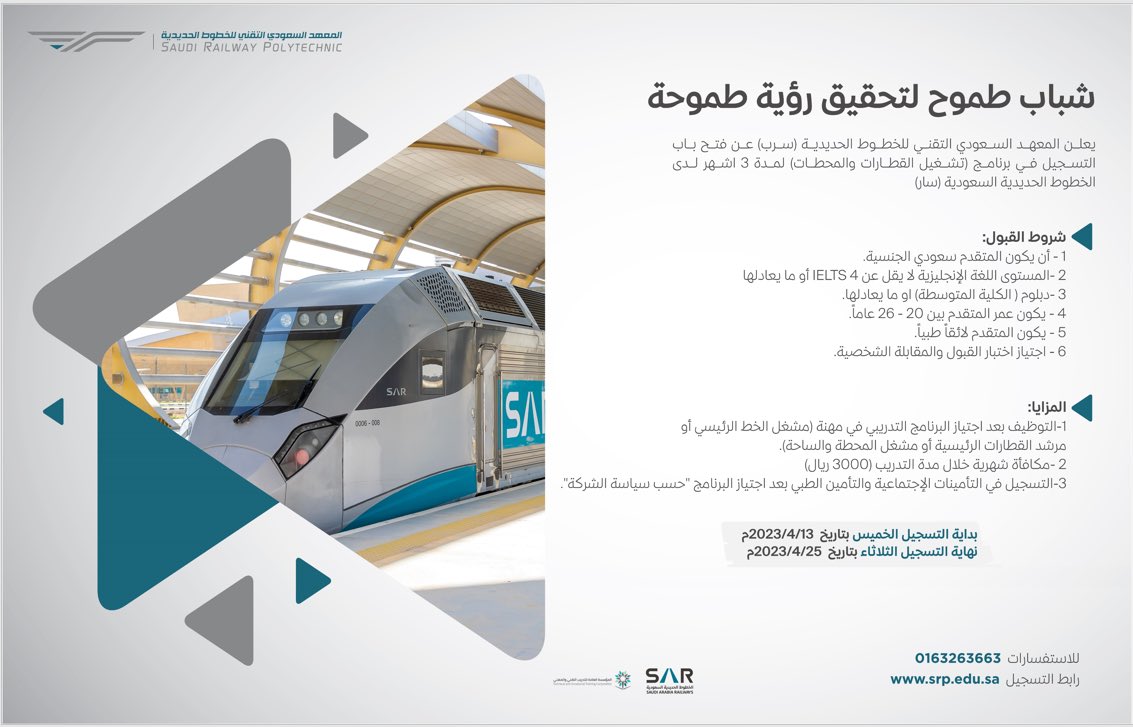 أعلن المعهد السعودي التقني للخطوط الحديدية (سرب) عن فتح باب التسجيل في برنامج (تشغيل القطارات والمحطات) لمدة 3 اشهر لدى الخطوط الحديدية السعودية (سار).