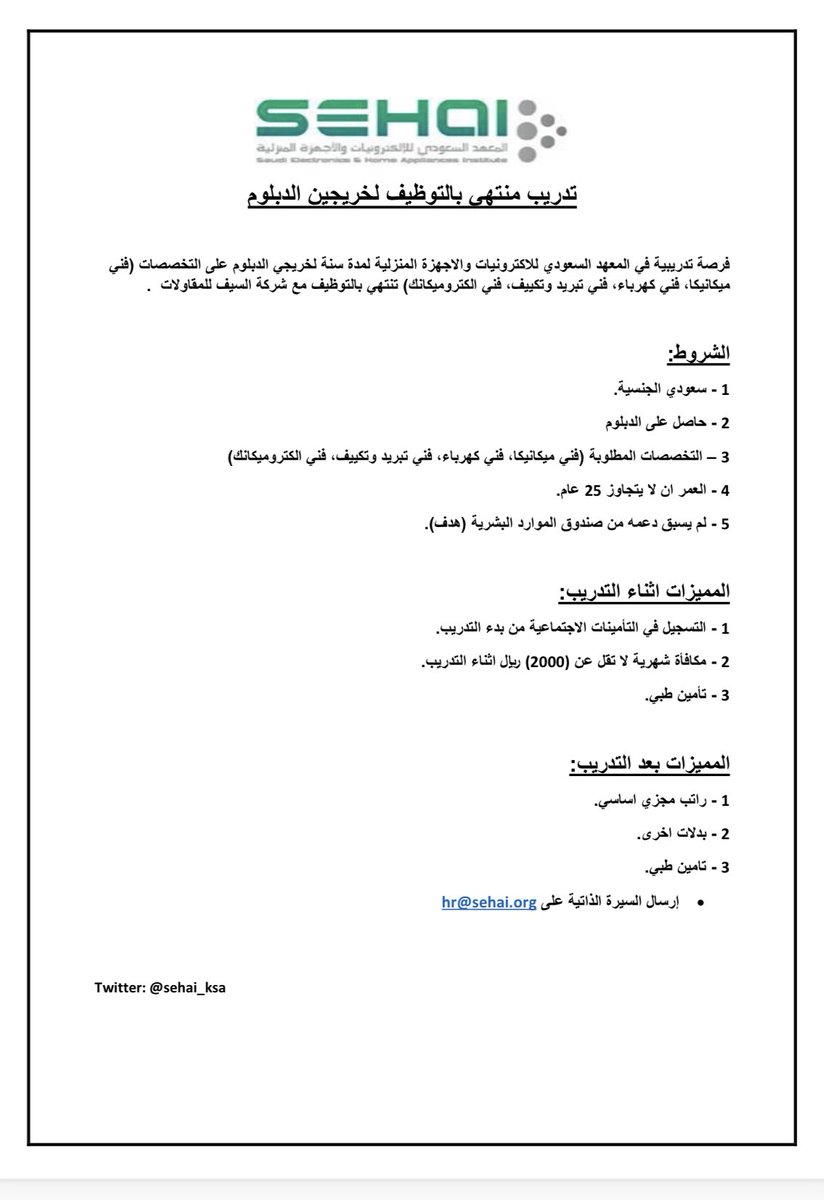 اعلن المعهد السعودي للإلكترونيات والأجهزة المنزلية (سيهاي) تدريب منتهي بالتوظيف لخريجي الدبلوم للعمل مع شركة السيف للمقاولات.