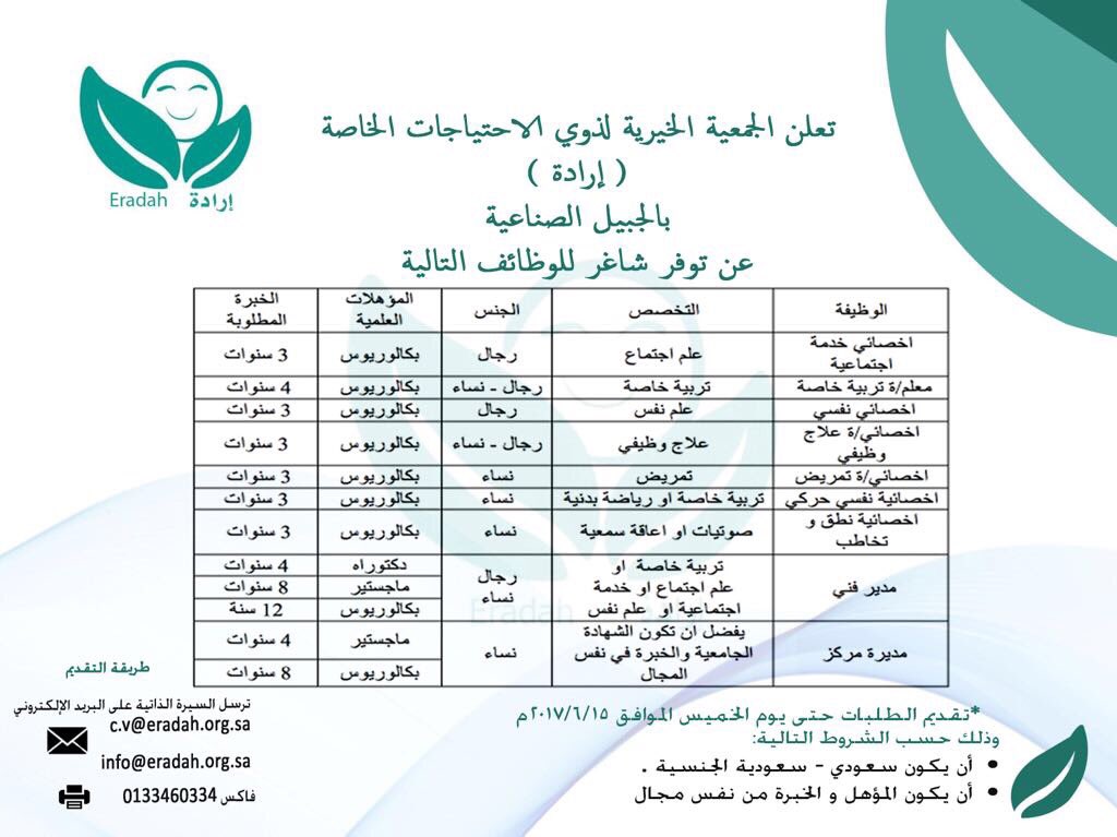 أعلنت الجمعية الخيرية لذوي الاحتياجات الخاصة “إرادة” بالجبيل الصناعية، عن توفّر وظائف تعليمية وصحية وإدارية شاغرة للجنسين، وذلك وفق الشروط التالية: