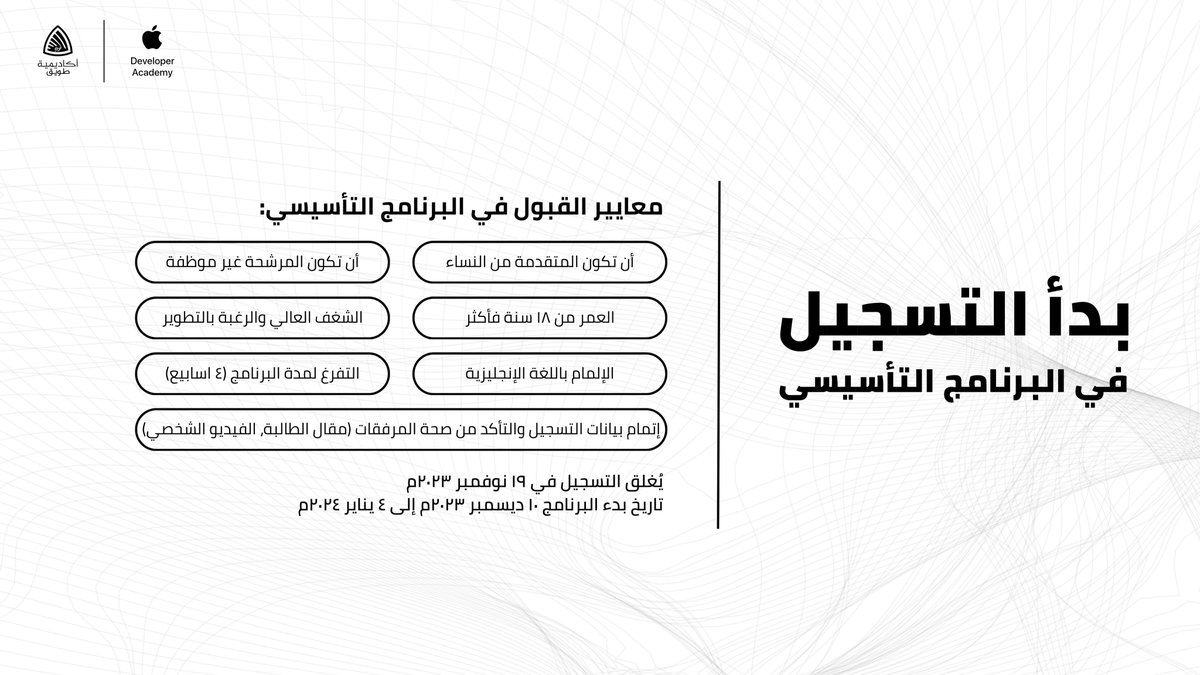 أكاديمية مطوري آبل (أول أكاديمية في الشرق الأوسط وشمال أفريقيا، شراكة بين آبل وأكاديمية طويق) عن فتح باب القبول في (البرنامج التأسيسي).
