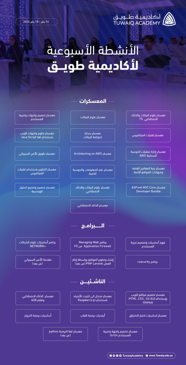 اعلنت أكاديمية طويق التابعة (للاتحاد السعودي للأمن السيبراني والبرمجة والدرونز) عن أكثر من 50 برنامج ومعسكر تدريبي (عن بُعد) و (حضوري).