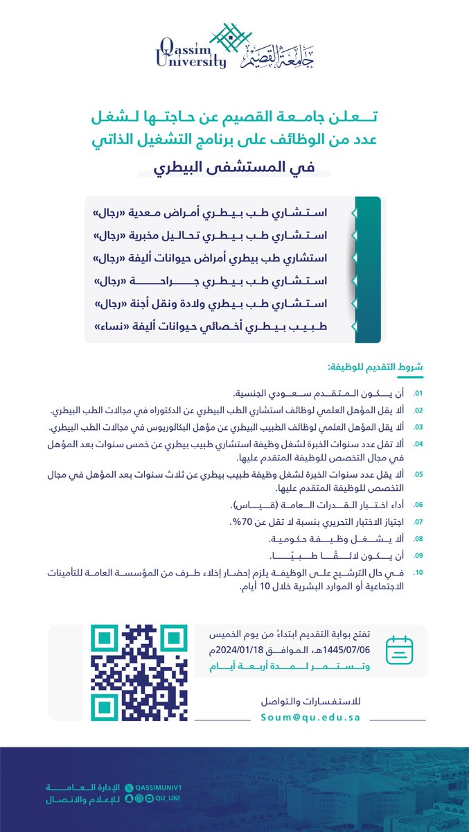 اعلنت جامعة القصيم عدد من الوظائف على برنامج التشغيل الذاتي (رجال / نساء) في المستشفى البيطري.