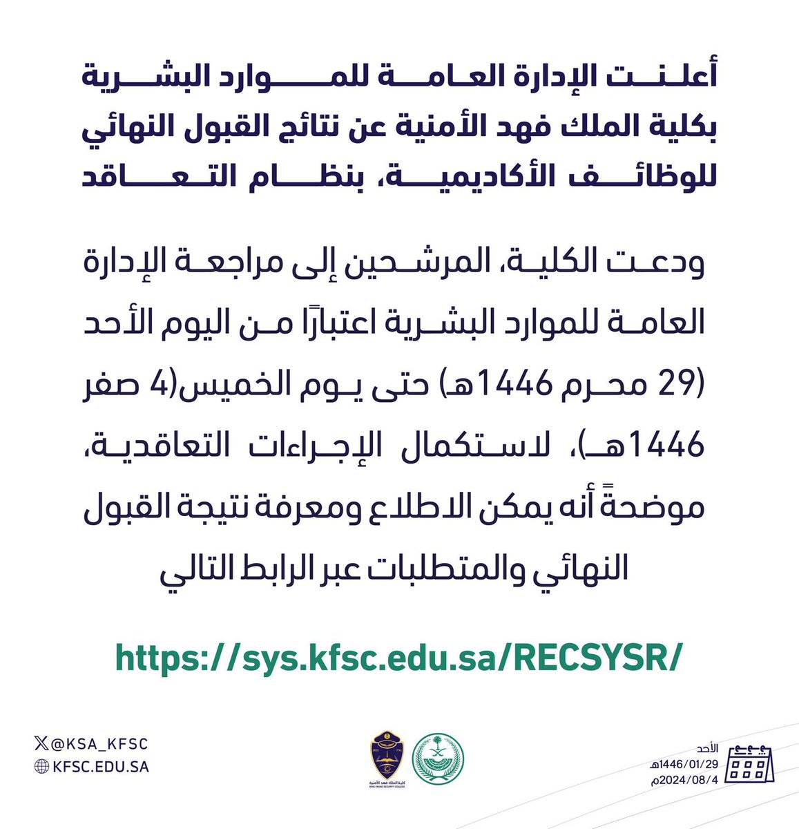 مُمثلة في الإدارة العامة للموارد البشرية عن نتائج القبول النهائي للوظائف الأكاديمية، بنظام التعاقد ودعت الكلية، المرشحين إلى مراجعة الإدارة العامة للموارد البشرية اعتبارًا من (اليوم الأحد 29 محرم 1446هـ حتى يوم الخميس 4 صفر 1446هـ)، لاستكمال الإجراءات التعاقدية.