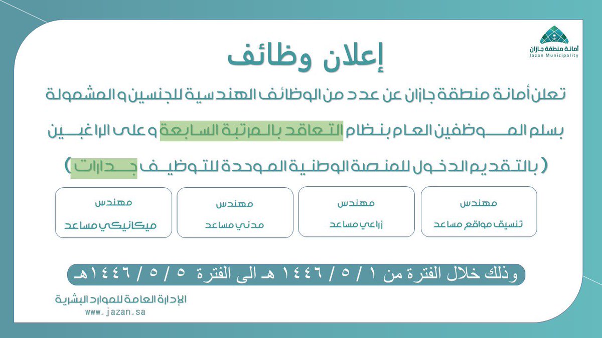 اعلنت أمانة منطقة جازان عبر منصة (جدارات) وظائف (رجال / نساء) للحاصلين على الدرجات العلمية والتخصصات المناسبة لشغل وظائف المشمولة بسلم الموظفين العام عن طريق التعاقد وفق ما ورد في اللائحة التنفيذية للموارد البشرية في الخدمة المدنية.