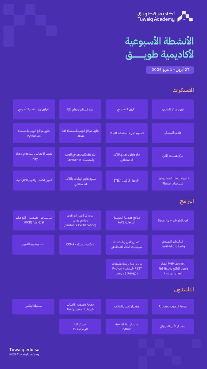 اعلنت أكاديمية طويق فتح باب التسجيل في عدة دورات ومعسكرات ودورات تدريبية مكثفة، تُقام حضوريًا في مقر الأكاديمية بمدينة الرياض، وذلك وفقًا للتفاصيل وطريقة التقديم الموضحة أدناه.